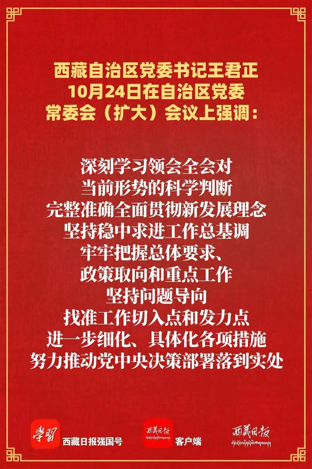 10月24日,自治区党委书记王君正主持召开自治区党委常委会(扩大)会议,传达学习党的二十届四中全会精神。他强调,要认真学习贯彻习近平总书记重要讲话精神,加快推动社会主义现代化新西藏建设。